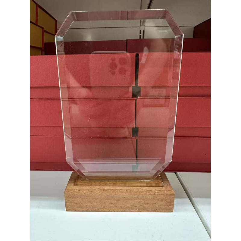 It features a shield-shaped clear crystal panel mounted on a wooden or crystal base.