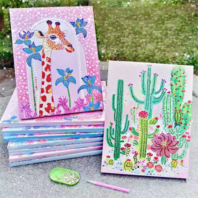 The kits come in different designs, such as the giraffe and cactus designs shown in the image, and can be found in various sizes and formats, including canvases and notebooks.