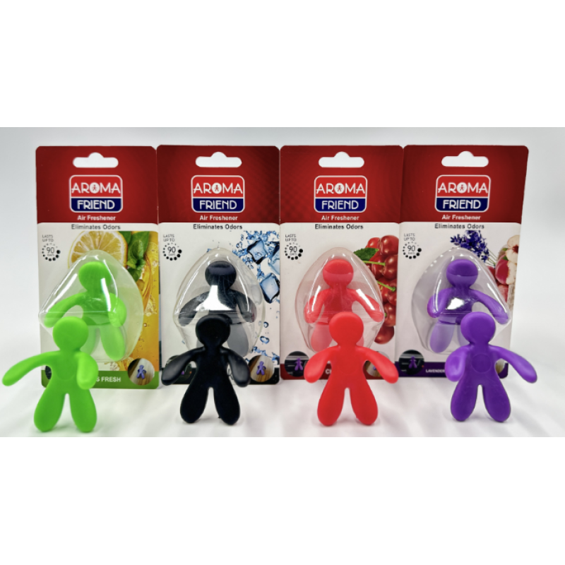 Aroma Friend air fresheners, which are designed to eliminate odors in various spaces. They are shaped like small, flexible human figures and are often used as car air fresheners.