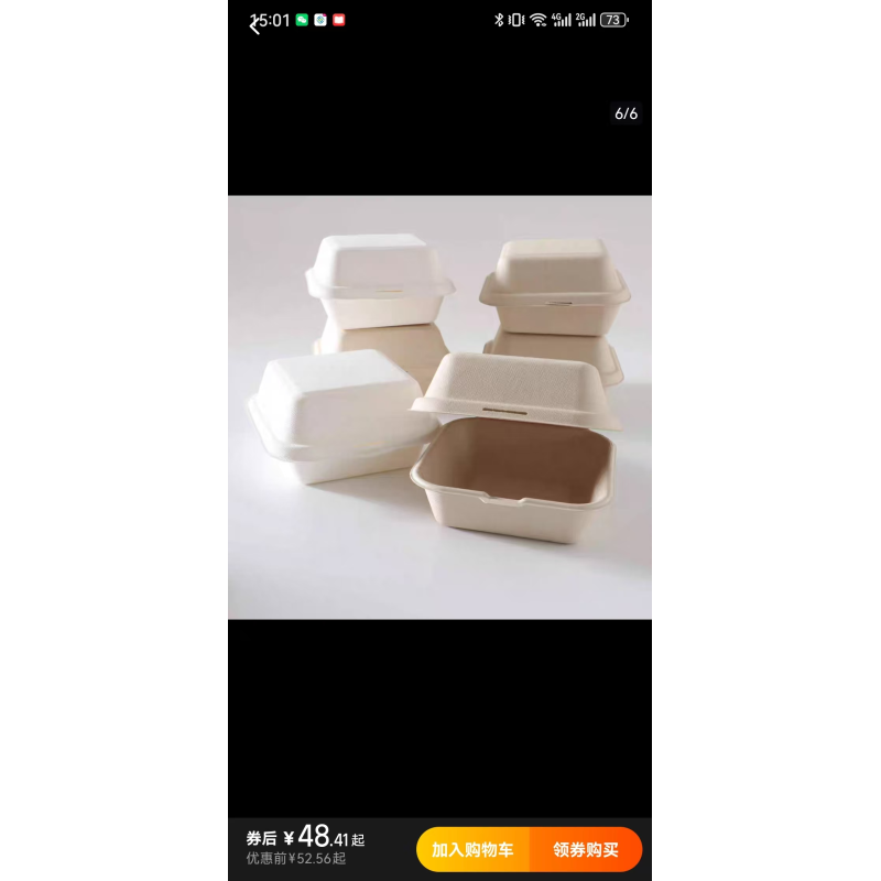 biodegradable clamshell food containers made from sugarcane bagasse.