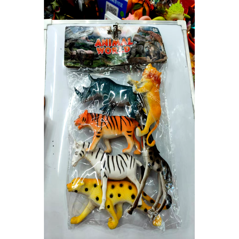 Animals typically included in these sets are a giraffe, lion, tiger, elephant, zebra, and rhino.
