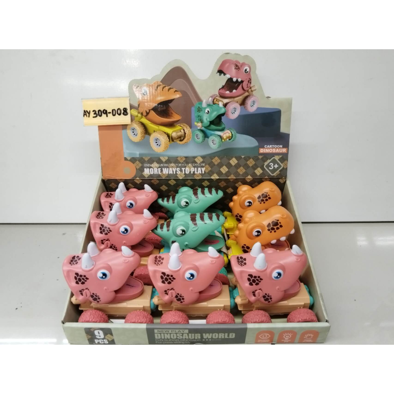 The toys are friction-powered, meaning no batteries are needed; simply press the dinosaur's head to make the car move forward.