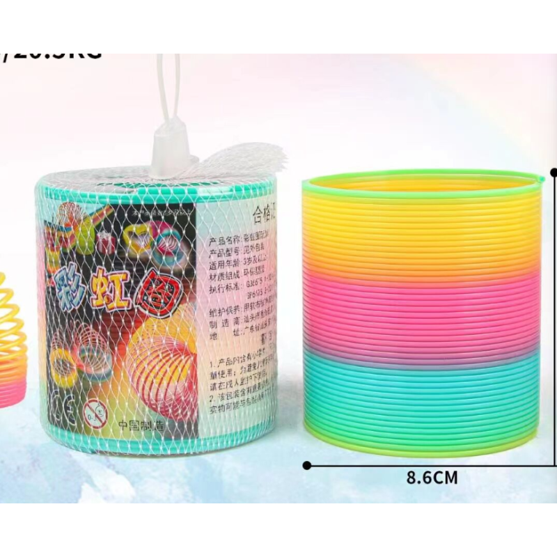 This toy is made from plastic and features vibrant, multi-colored bands.