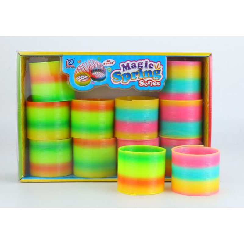 This toy is made from plastic and features vibrant, multi-colored bands.