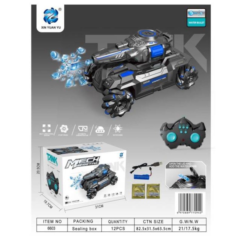 Inclusions: The package usually comes with the tank, a remote control, a USB charging cable, a rechargeable battery pack, and a supply of water bombs.