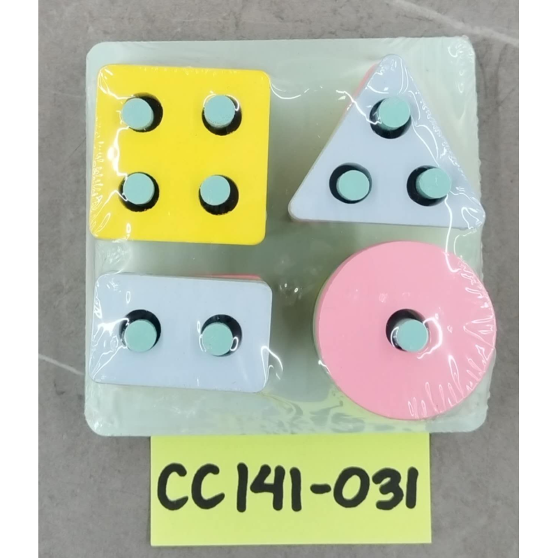 Description: This Montessori-inspired toy features geometric shapes in bright colors (yellow square, light blue triangle, light blue rectangle, pink circle) that fit onto corresponding pegs on a wooden base.