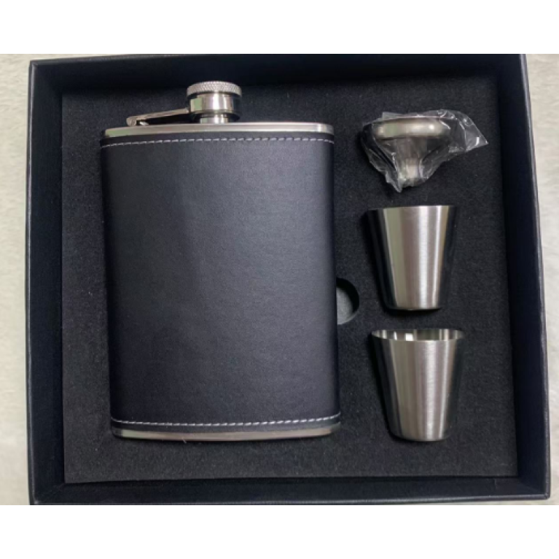 includes a hip flask, two small shot cups, and often a small funnel, all presented in a gift box.