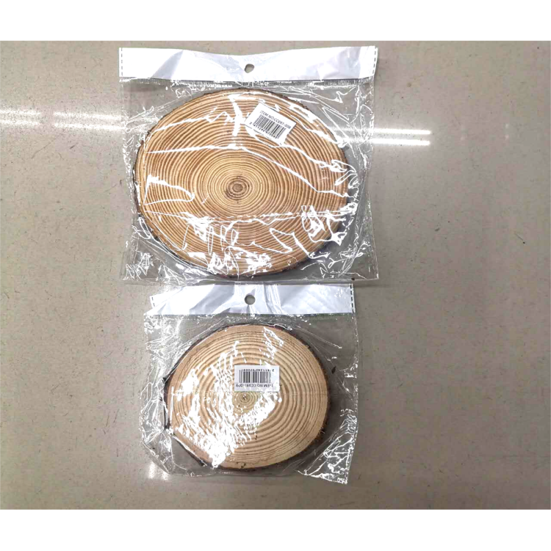 Packages of natural, unfinished wood slices with bark, commonly used for various crafts and decorations.