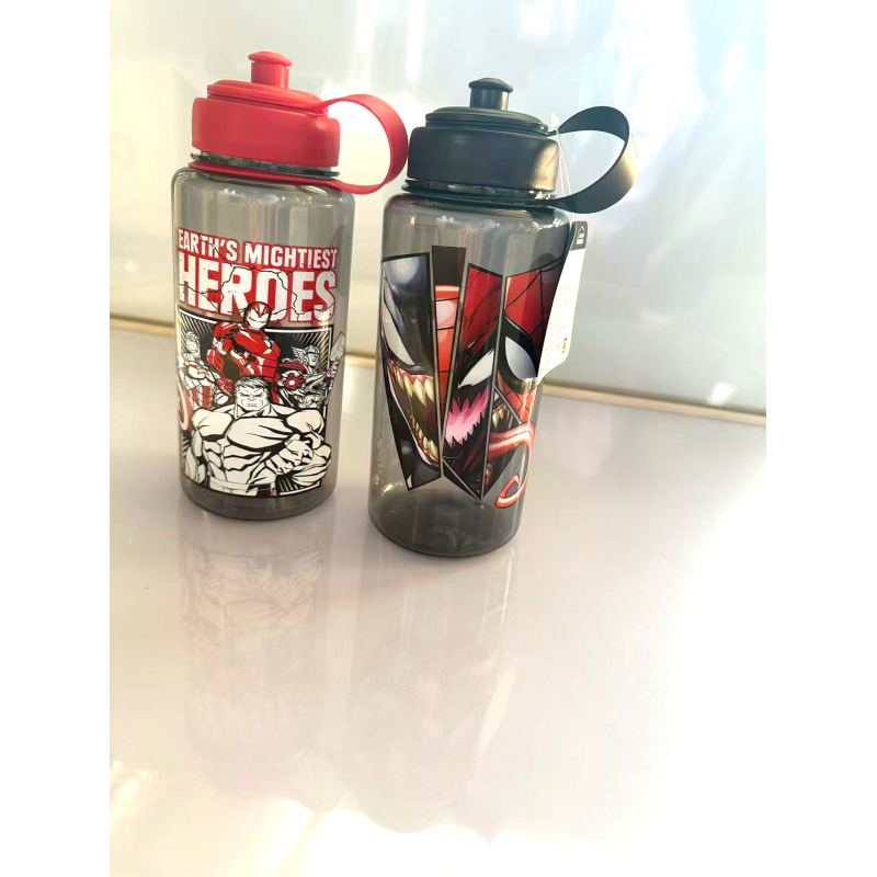The designs include "Earth's Mightiest Heroes" graphics on one bottle and Spider-Man themed graphics on the other.