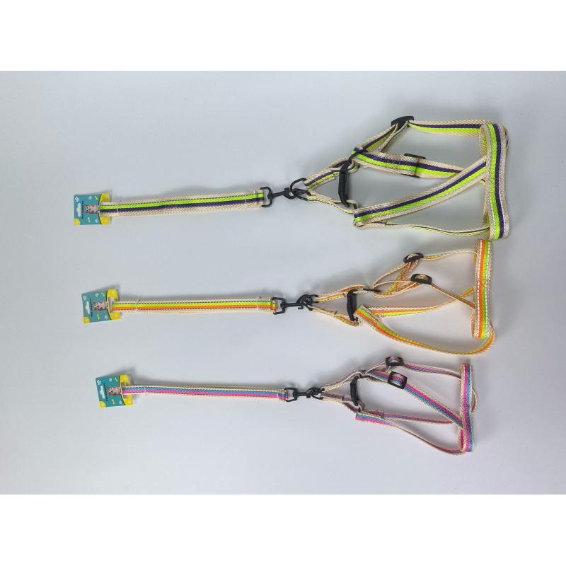 The harnesses in the image are available in at least three colors: yellow/green, orange/yellow, and pink/red.
