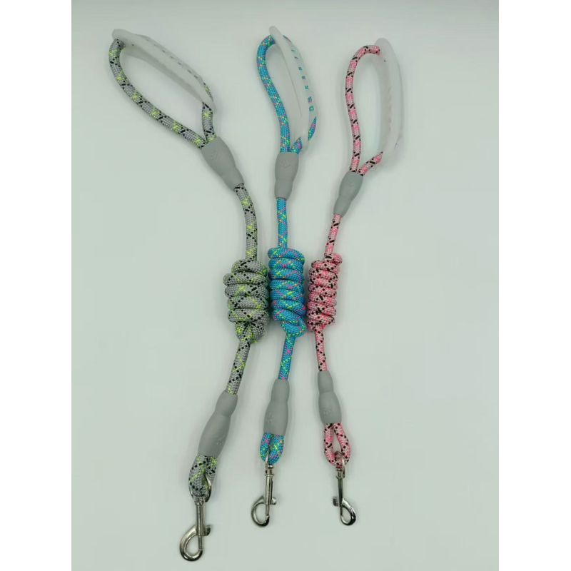 The leashes in the image are made from a braided rope material with a hand loop on one end and a metal clip (carabiner) for attachment to a collar or harness on the other.