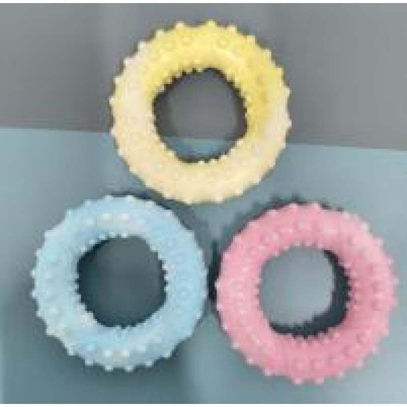 These are multi-colored thermoplastic rubber (TPR) dog chew rings.