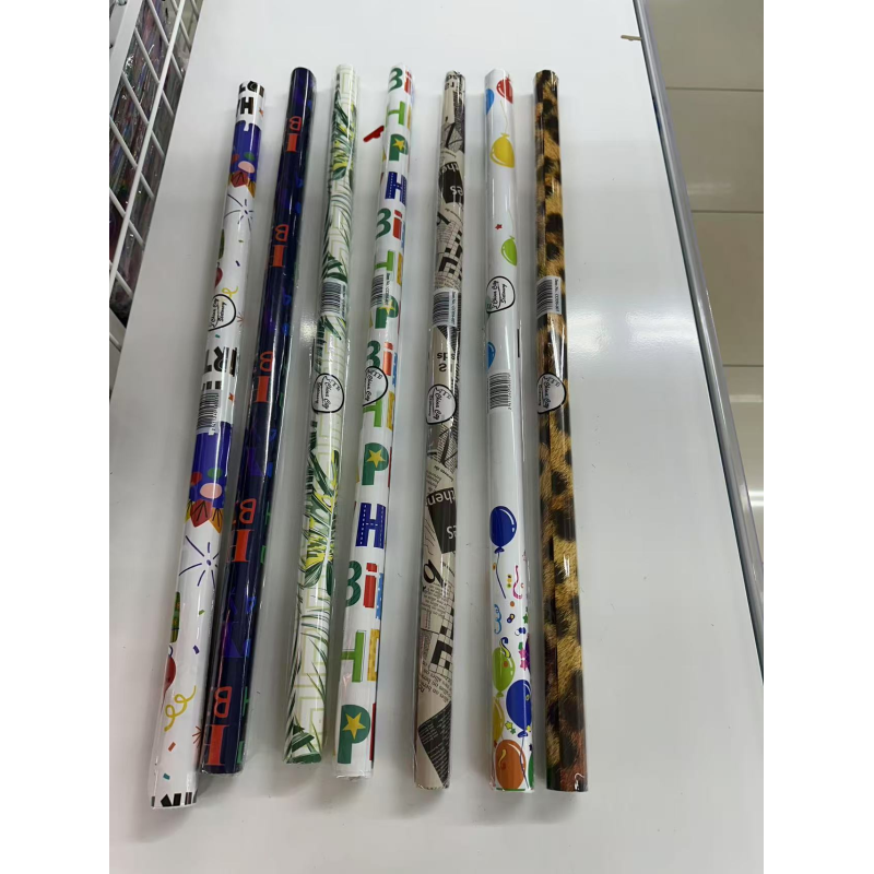 gift wrapping paper with a repeating "HAPPY BIRTHDAY" pattern.