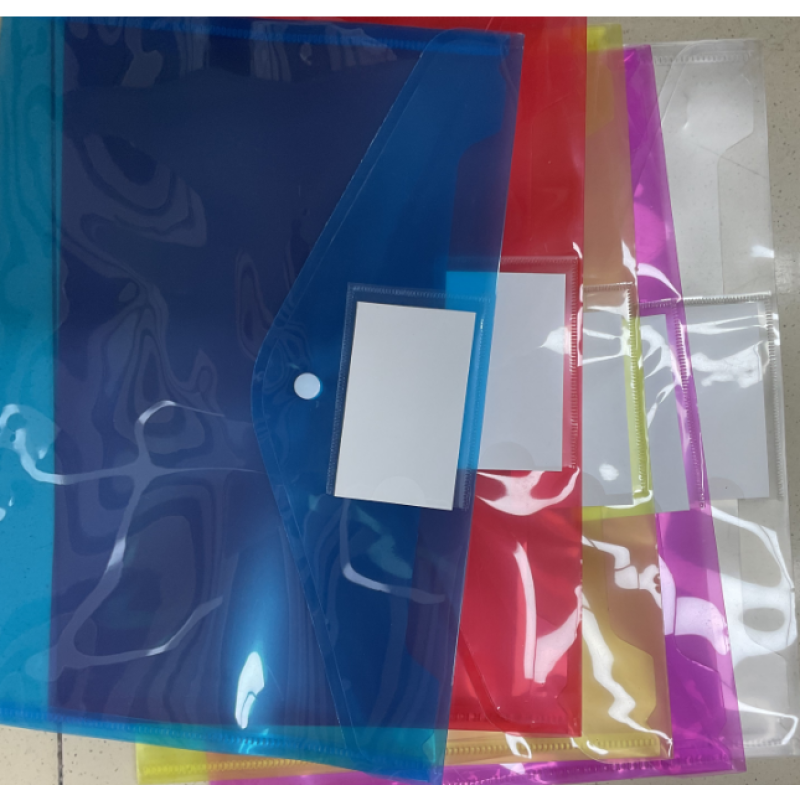 A4 plastic carry folders with snap-button closures. These are used for organizing and protecting documents at home, school, or the office.