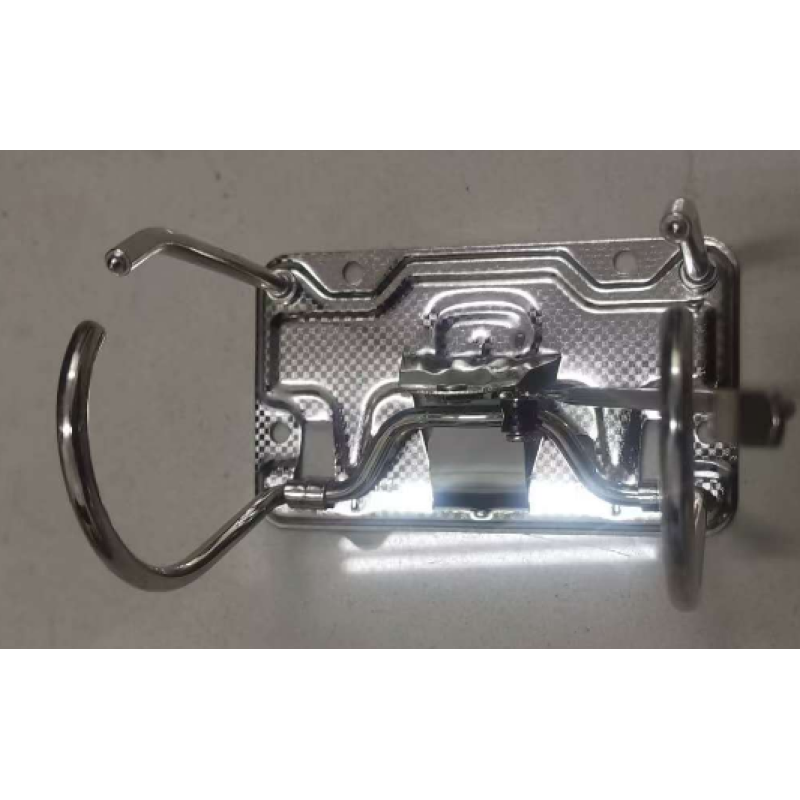 metal lever arch file clip (or mechanism). This component is used in file folders and binders to securely hold and organize punched documents.