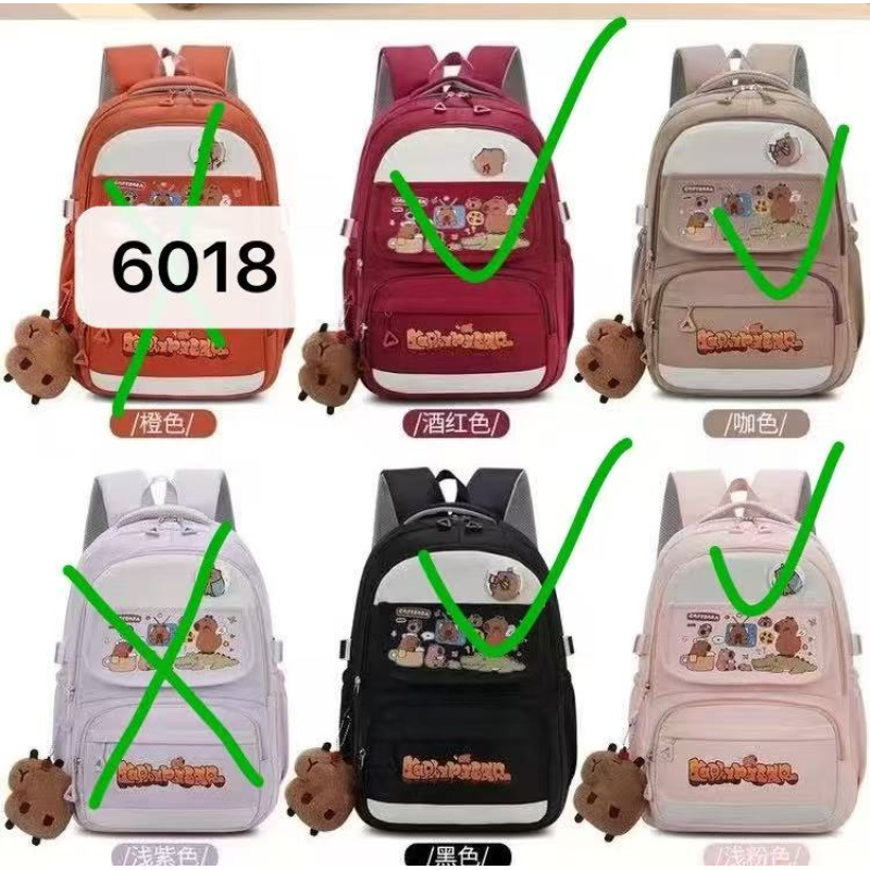 collection of Capybara backpacks, model 6018, available in several color variants including orange, wine red, coffee, light purple, and black.